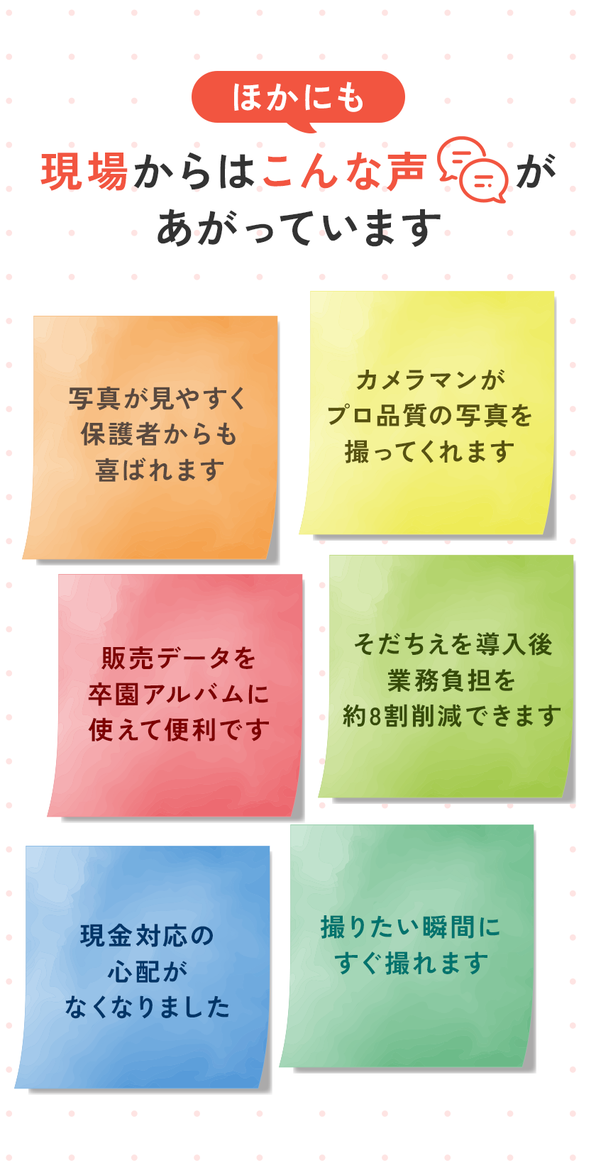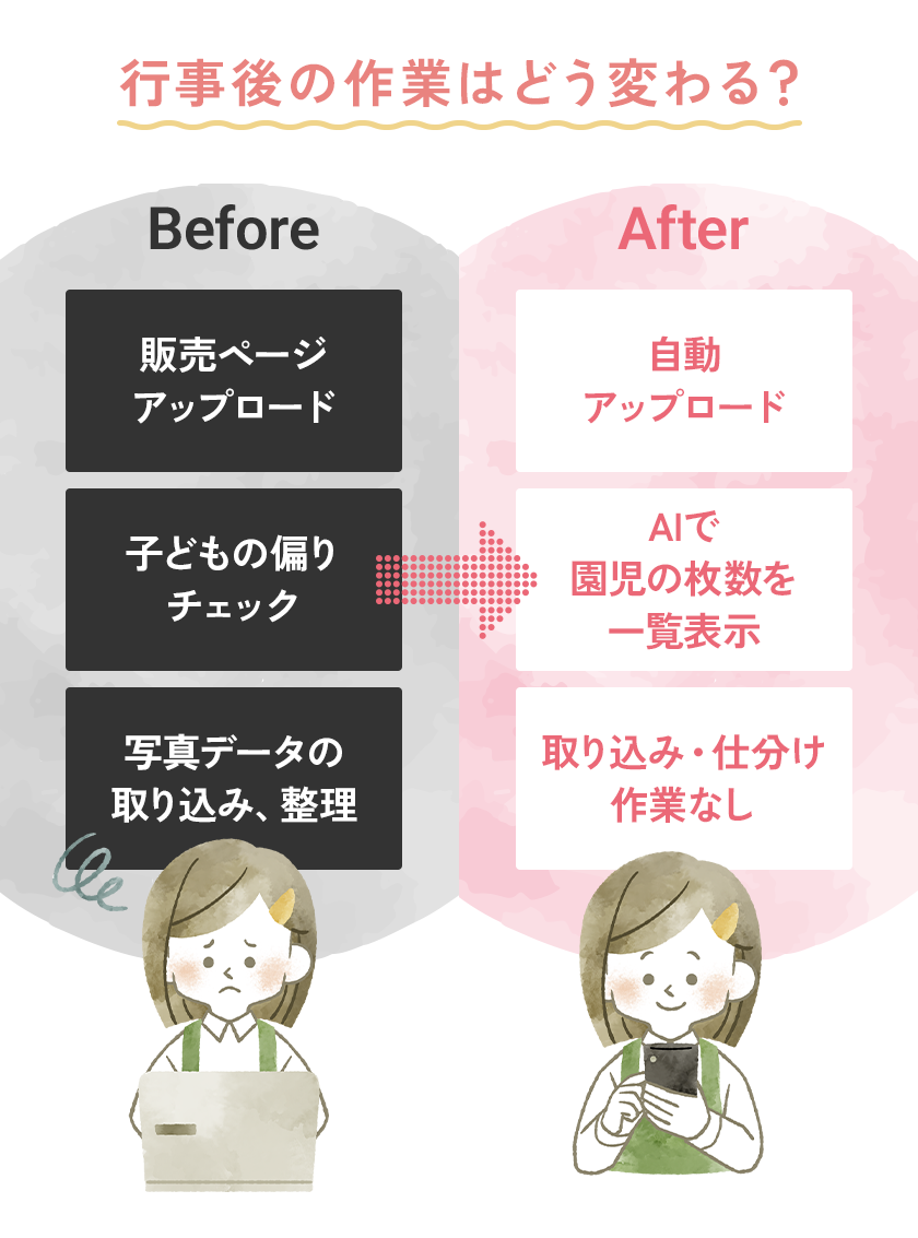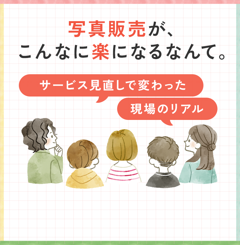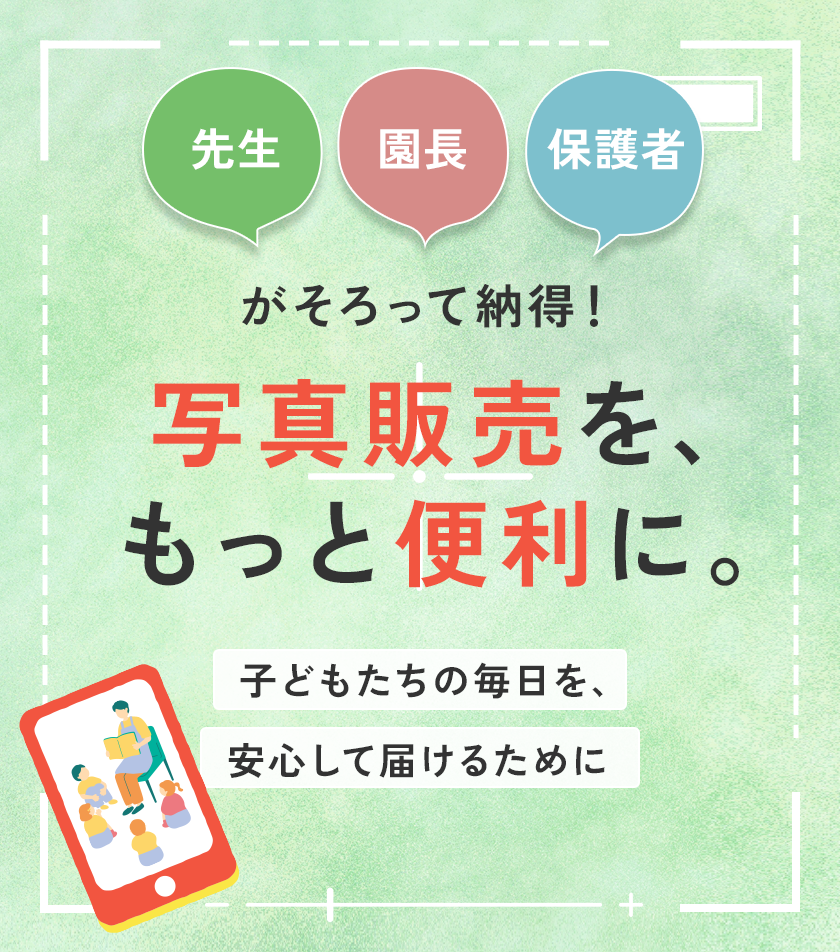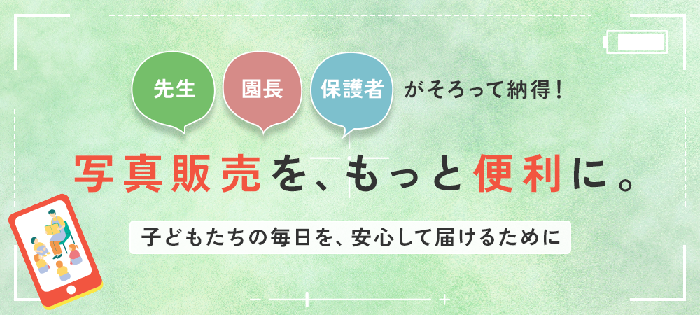 撮影から販売・決済までを一括でサポートし、園・先生・保護者それぞれが使いやすい仕組みを提供します。