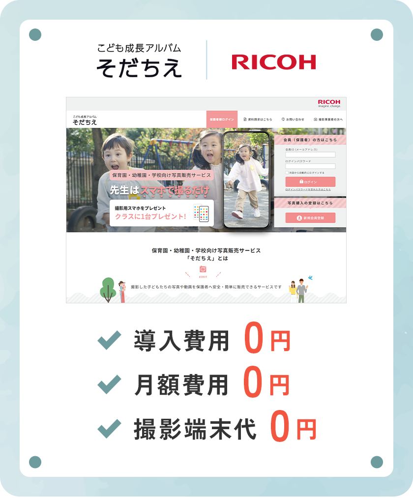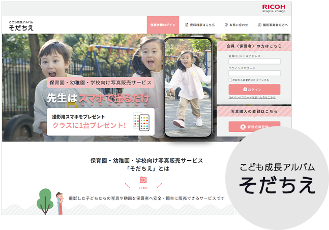 リコー こども成長アルバム「そだちえ」は、園で撮影した写真や動画を、安全に保護者へオンライン販売できる写真販売サービスです。